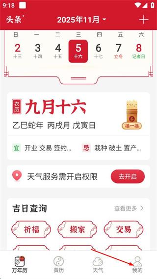 4、登錄后點擊底部“黃歷”,即可查看對應(yīng)日期的黃歷信息。