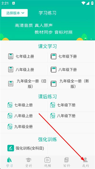 (1)包含七年級到九年級的單詞和課文(同步翻譯),且都配有高清的真人發(fā)音,可跟讀、可點讀。