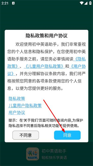 1、打開初中英語助手,在彈出的窗口中,點擊同意。