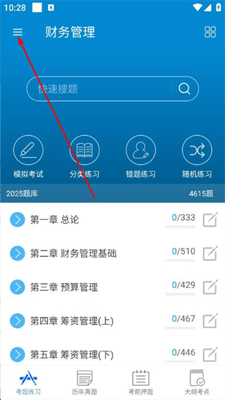 1、打開中級會計考試app,點擊左上角的菜單圖標(biāo)。