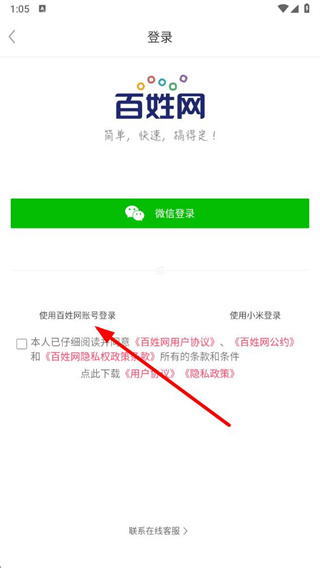 2、在登錄頁(yè)面點(diǎn)擊使用百姓網(wǎng)賬號(hào)登錄,進(jìn)入賬號(hào)登錄界面。
