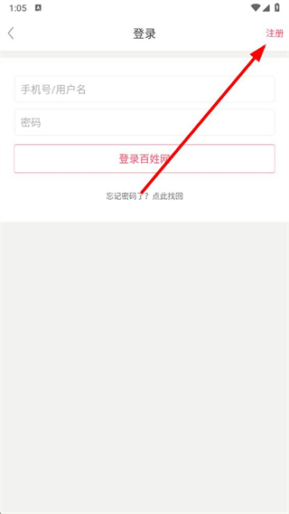 3、在賬號(hào)登錄界面點(diǎn)擊右上角注冊(cè)選項(xiàng),進(jìn)入加入百姓網(wǎng)頁(yè)面。