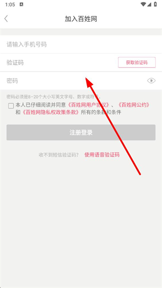 4、在加入百姓網(wǎng)頁(yè)面輸入手機(jī)號(hào)碼、驗(yàn)證碼和密碼,勾選同意協(xié)議后,即可完成賬號(hào)注冊(cè)。