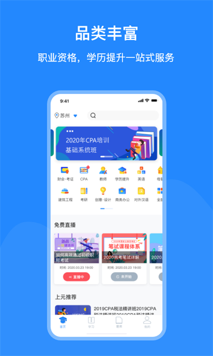 上元教育APP是由上元教育集團(tuán)研發(fā)的一款實(shí)用型多功能學(xué)習(xí)平臺(tái),以實(shí)現(xiàn)線上即時(shí)互動(dòng)、提供快速便捷的線上用戶學(xué)習(xí)體驗(yàn)為目標(biāo),為職業(yè)培訓(xùn)學(xué)員量身打造打造一站式職業(yè)教育的APP,突破時(shí)空限制,讓知識(shí)獲取方式更為靈活便捷,課程的時(shí)間一般控制在30分鐘左右,你在等公交和地鐵的時(shí)間就可以登錄上元教育APP進(jìn)行學(xué)習(xí),成功來(lái)自對(duì)碎片化時(shí)間的利用,上元教育致力于幫助每一個(gè)有夢(mèng)想的年輕人走向成功。