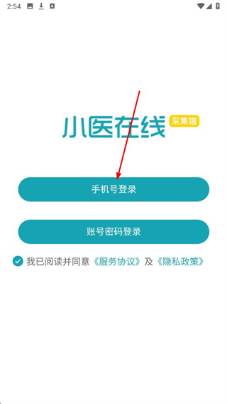 1、打開小醫(yī)在線采集端APP,選擇手機(jī)號(hào)登錄方式。