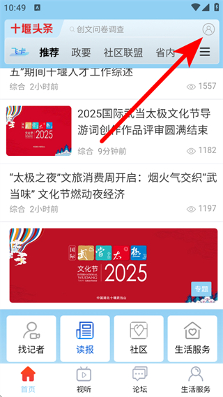 1、打開十堰頭條APP首頁,點(diǎn)擊右上角個(gè)人圖標(biāo),進(jìn)入個(gè)人中心頁面。