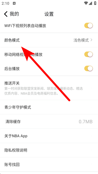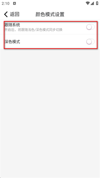 4、在顏色模式設置頁面,可選擇開啟跟隨系統(tǒng)或深色模式的開關。
