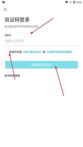 2、輸入手機號,勾選用戶服務(wù)協(xié)議和隱私政策,點擊獲取短信驗證碼。