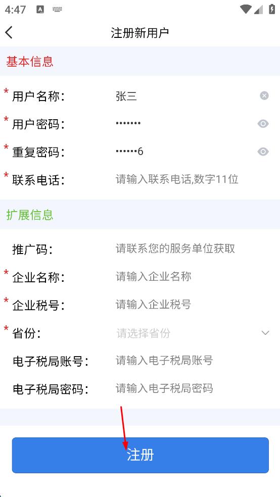 4、基本信息和擴(kuò)展信息都填寫完畢后,點(diǎn)擊“注冊(cè)”按鈕,即可完成智云e票APP的注冊(cè)操作。