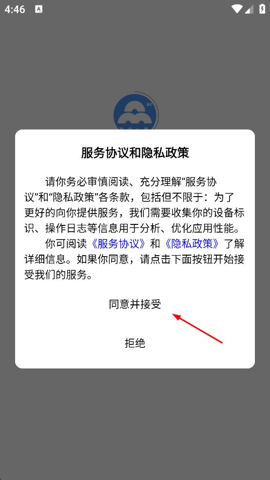1、打開智云e票APP,會(huì)彈出服務(wù)協(xié)議和隱私政策提示框,仔細(xì)閱讀相關(guān)內(nèi)容后,點(diǎn)擊“同意并接受”按鈕,進(jìn)入APP登錄界面。