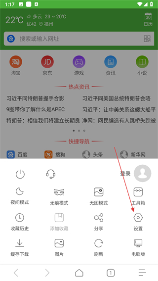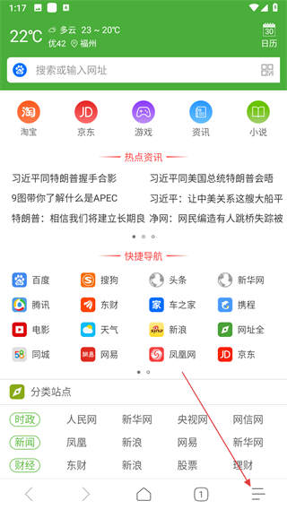 1、極速瀏覽器點擊底部菜單欄最右側(cè)的三橫線按鈕,打開功能菜單。