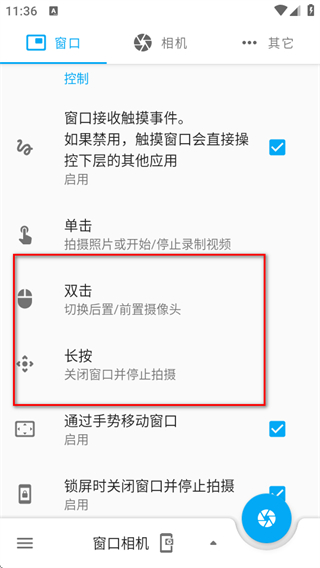 4、在控制設(shè)置中,可設(shè)置雙擊切換后置/前置攝像頭、長按關(guān)閉窗口并停止拍攝等功能,完成參數(shù)設(shè)置。