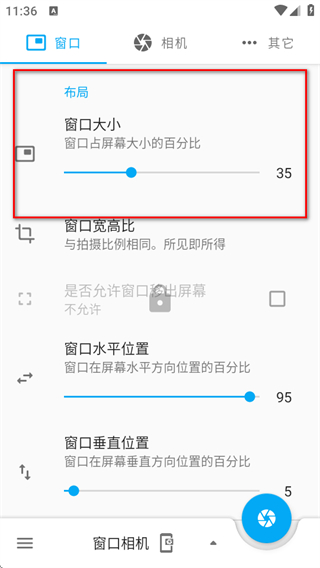 3、在布局設(shè)置中,可調(diào)整窗口大小的占屏百分比。