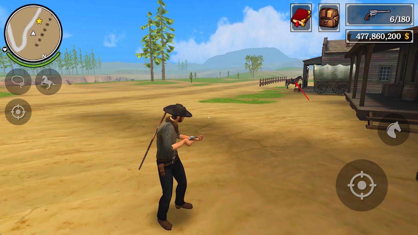2、游戲中途,利用金幣購買基礎(chǔ)武器與普通坐騎,參與賽馬挑戰(zhàn)贏取豐厚獎勵,在與敵人對決時緊盯倒計(jì)時,練習(xí)快速轉(zhuǎn)身開槍技巧,避免被擊殺。
