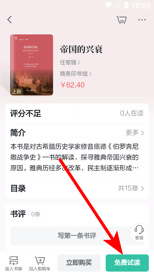 2、在書籍詳情頁(yè)面,點(diǎn)擊免費(fèi)試讀選項(xiàng),進(jìn)入閱讀界面。