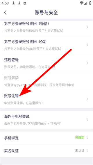 4、進(jìn)入賬號與安全頁面后,點(diǎn)擊賬號注銷選項,按照提示完成賬號注銷操作。