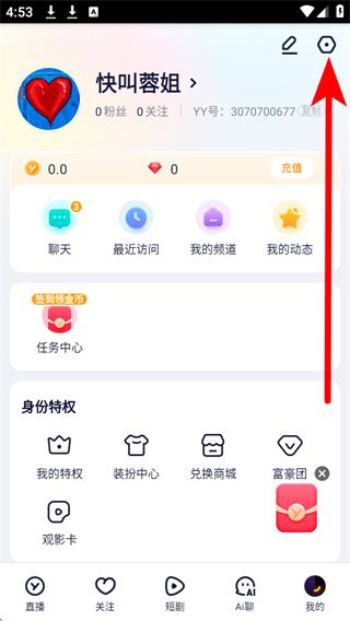 1、進(jìn)入YY我的頁面后,點(diǎn)擊右上角鉛筆形狀的編輯圖標(biāo),進(jìn)入個人資料編輯的界面。