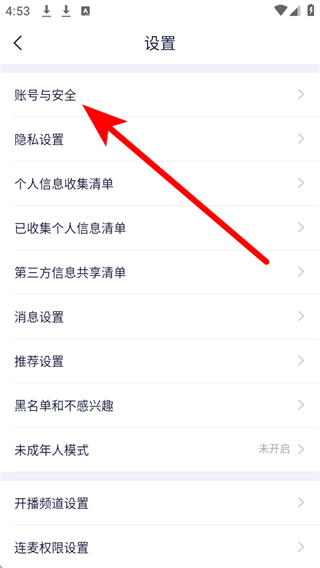 3、在設(shè)置頁面中,點(diǎn)擊賬號與安全選項。