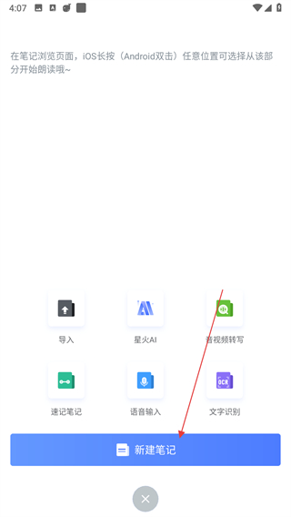 2、在彈出的功能選擇頁面,點擊新建筆記按鈕。