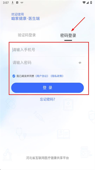 1、打開咱家健康醫(yī)生端APP,選擇密碼登錄方式,輸入手機(jī)號(hào)和密碼,勾選用戶協(xié)議,點(diǎn)擊登錄。