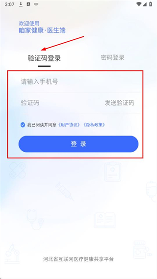2、也可選擇“驗(yàn)證碼登錄”方式,輸入手機(jī)號(hào),點(diǎn)填入收到的驗(yàn)證碼,勾選協(xié)議,點(diǎn)擊登錄。