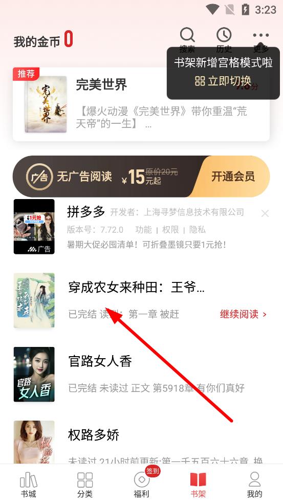 1、打開(kāi)追書神器app進(jìn)入書架界面,點(diǎn)擊想要分享的書籍進(jìn)入閱讀界面。