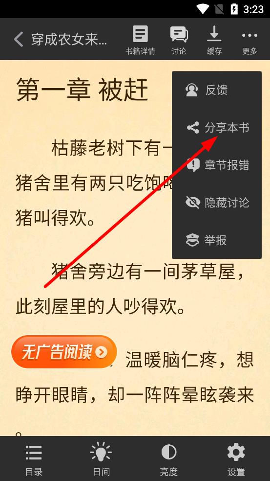 2、在閱讀界面中點(diǎn)擊屏幕右上角的更多按鈕,在彈出的菜單里選擇分享本書。