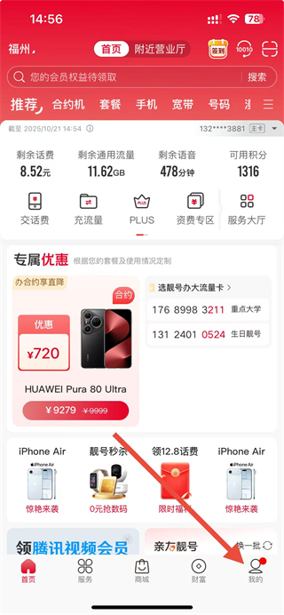 1、打開中國聯(lián)通APP,在首頁點擊右下角我的選項。