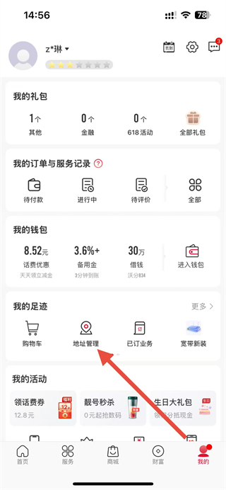 2、進(jìn)入我的頁面后,找到并點擊地址管理選項。