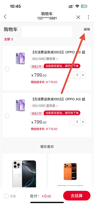 3、在購物車頁面點擊編輯選項,進入編輯模式。