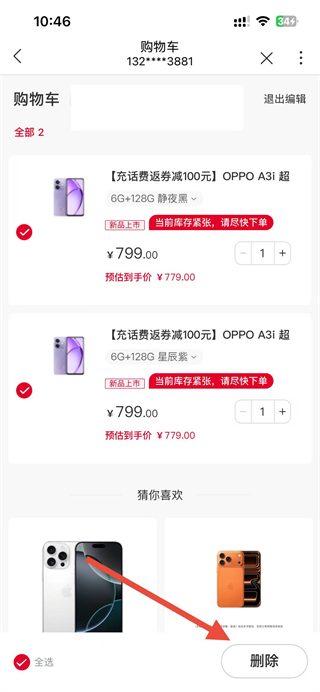4、在編輯模式下選擇要刪除的商品,點擊刪除按鈕,即可刪除購物車商品。