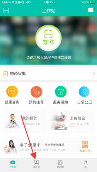 1、打開(kāi)居民健康醫(yī)生版APP,點(diǎn)擊底部導(dǎo)航欄的通訊錄。