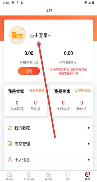 1、在5173游戲交易平臺首頁點擊右下角“我的”,進入個人中心頁面。