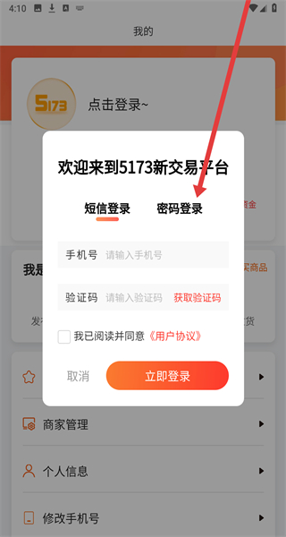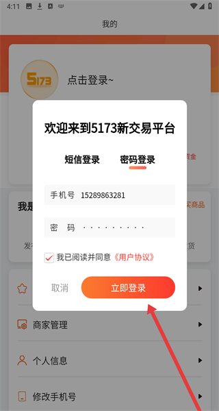4、在密碼登錄界面輸入手機號和密碼,勾選同意用戶協(xié)議后點擊“立即登錄”,完成賬號登錄操作。