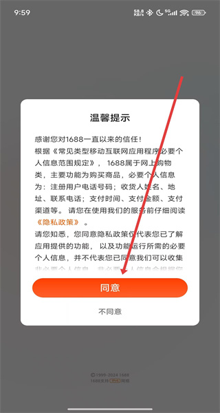 1、在打開(kāi)阿里巴巴App后,點(diǎn)擊溫馨提示彈窗中的同意按鈕,即可進(jìn)入首頁(yè)。