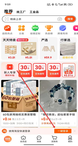 2、在進(jìn)入到首頁(yè)中時(shí),可以點(diǎn)擊下方一鍵登錄按鈕,一鍵使用淘寶賬號(hào)進(jìn)行登錄。