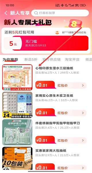 4、在登錄完成后,進(jìn)入新人專享頁(yè)面,可以點(diǎn)擊任意商品進(jìn)入查看詳情進(jìn)行購(gòu)買。
