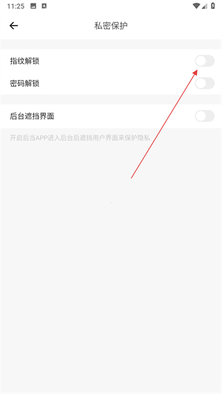 4、在私密保護(hù)頁(yè)面,點(diǎn)擊指紋解鎖的開關(guān)。
