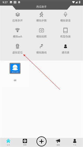 1、打開西瓜助手應(yīng)用程序進(jìn)入主頁界面,找到并點(diǎn)擊虛擬定位按鈕,進(jìn)入虛擬定位相關(guān)操作頁面。