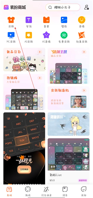 1、打開(kāi)搜狗輸入法,點(diǎn)擊底部導(dǎo)航欄中的商城,點(diǎn)擊皮膚選項(xiàng),進(jìn)入皮膚選擇界面。