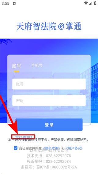 1、打開天府智法院APP,我們需要在登錄界面點擊忘記密碼。