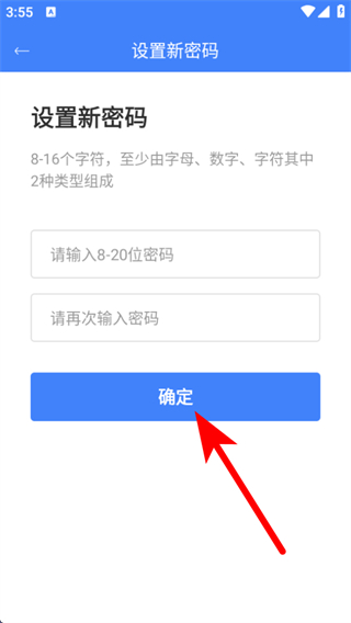 3、進入設(shè)置新密碼頁面,輸入新密碼后點擊確定,完成密碼找回操作。