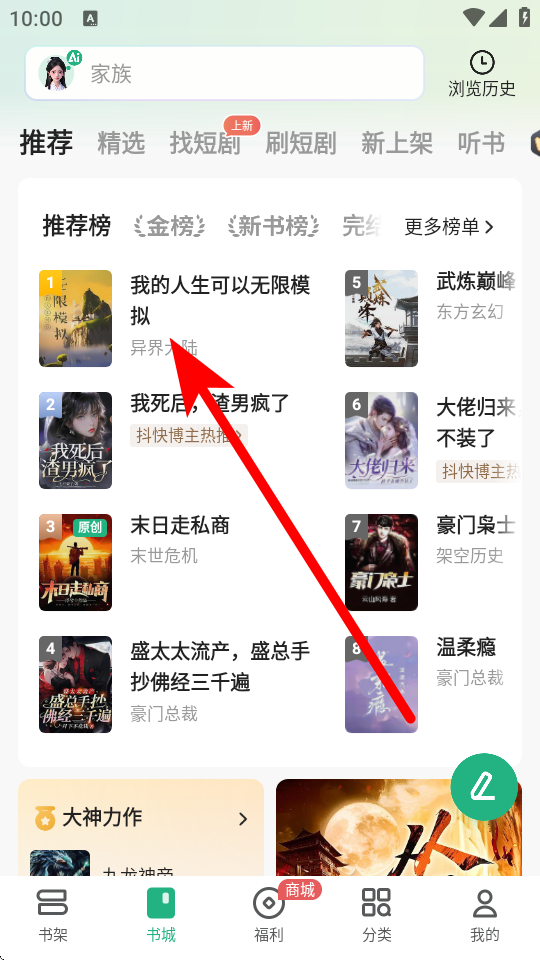 1、打開(kāi)書旗小說(shuō)APP,在書城的推薦榜等榜單中,選擇想要閱讀的小說(shuō),比如凡人修仙傳,點(diǎn)擊進(jìn)入小說(shuō)界面。
