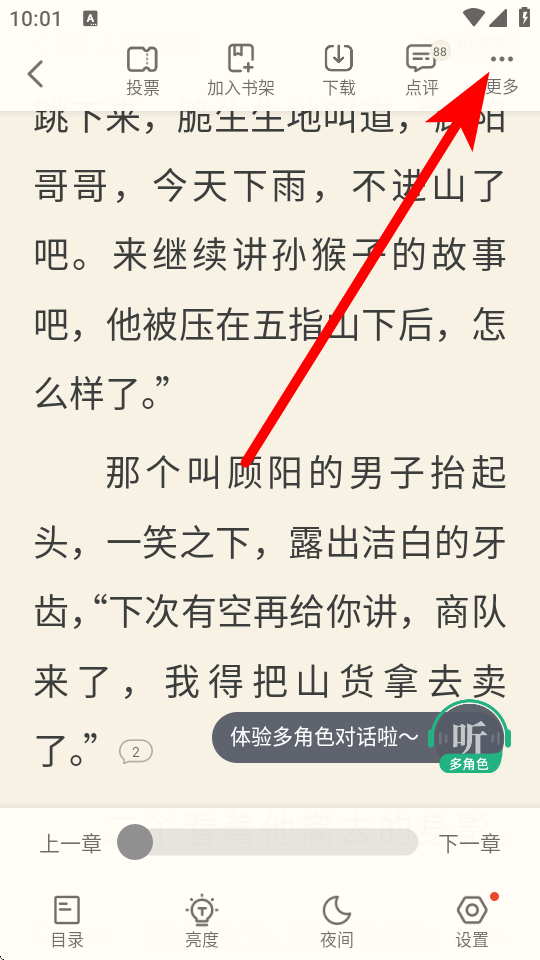 2、在小說(shuō)閱讀界面,點(diǎn)擊右上角更多按鈕,彈出功能列表。