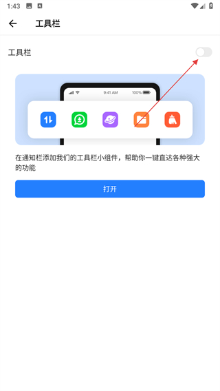 4、在工具欄頁(yè)面,點(diǎn)擊工具欄右側(cè)的開(kāi)關(guān)按鈕,將其開(kāi)啟。