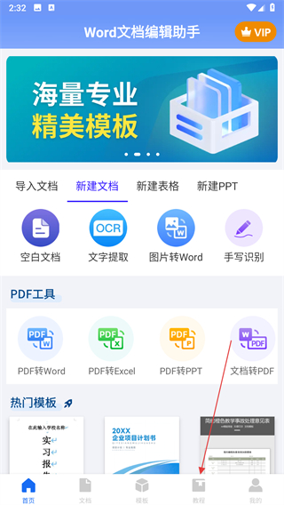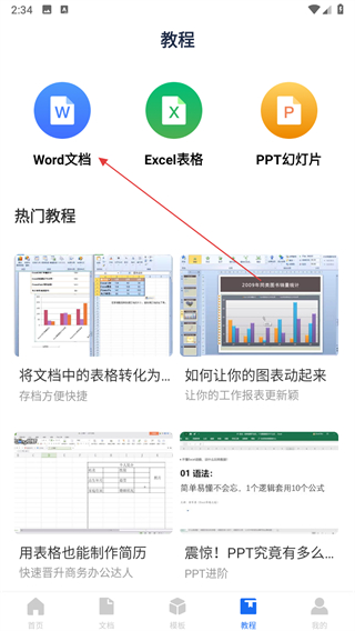1、打開Word文檔編輯助手應(yīng)用,點擊底部的教程選項。