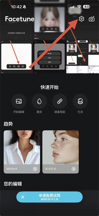 1、打開Facetune應(yīng)用,在主界面點擊右上角的設(shè)置齒輪圖標(biāo),進(jìn)入設(shè)置頁面。