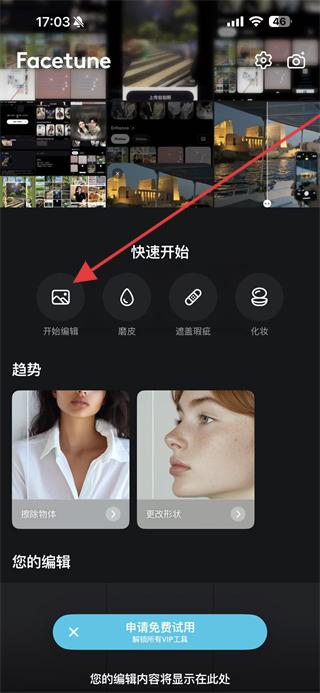 1、打開Facetune應(yīng)用,點擊開始編輯選項進(jìn)入圖片庫選擇界面。
