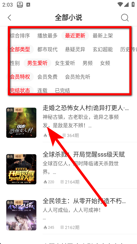 3、在全部小說頁面,通過篩選條件找到想聽的小說,點擊進入小說詳情界面。