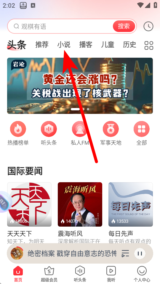 1、在蜻蜓FM首頁,點擊小說選項,進入小說頻道頁面。